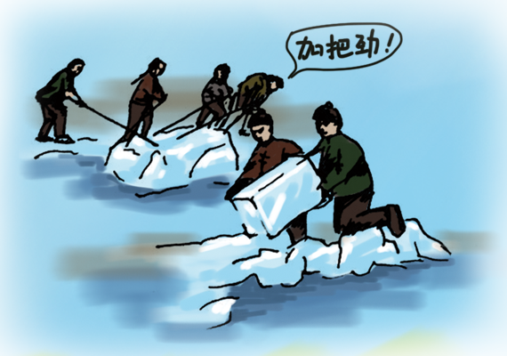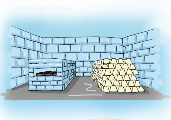 冰窖一分为二,一部分储存冰坨,另一部分用于冷冻完成灌模的冰棍。