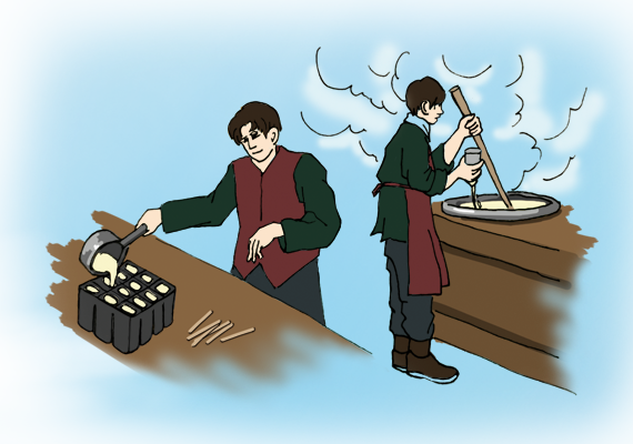 将奶坨打碎后放入锅中熬制,根据欧洲宫廷古法制作冰棍的秘方,加入特定比例的糖、鸡蛋清以及纯天然香料,再倒入冰棍模具中运回冰窖冷冻。
